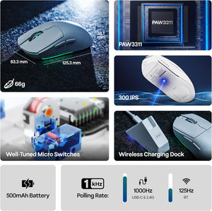 MechLands AJAZZ AJ139 V2 MC Gaming Mouse with Charging Base, Adjustable 12,000 DPI, PAW3311 Sensor, 3 Modes Wireless Mouse, 500mAh Battery, 1000 Polling Rate, 66g Lightweight, Win/Mac